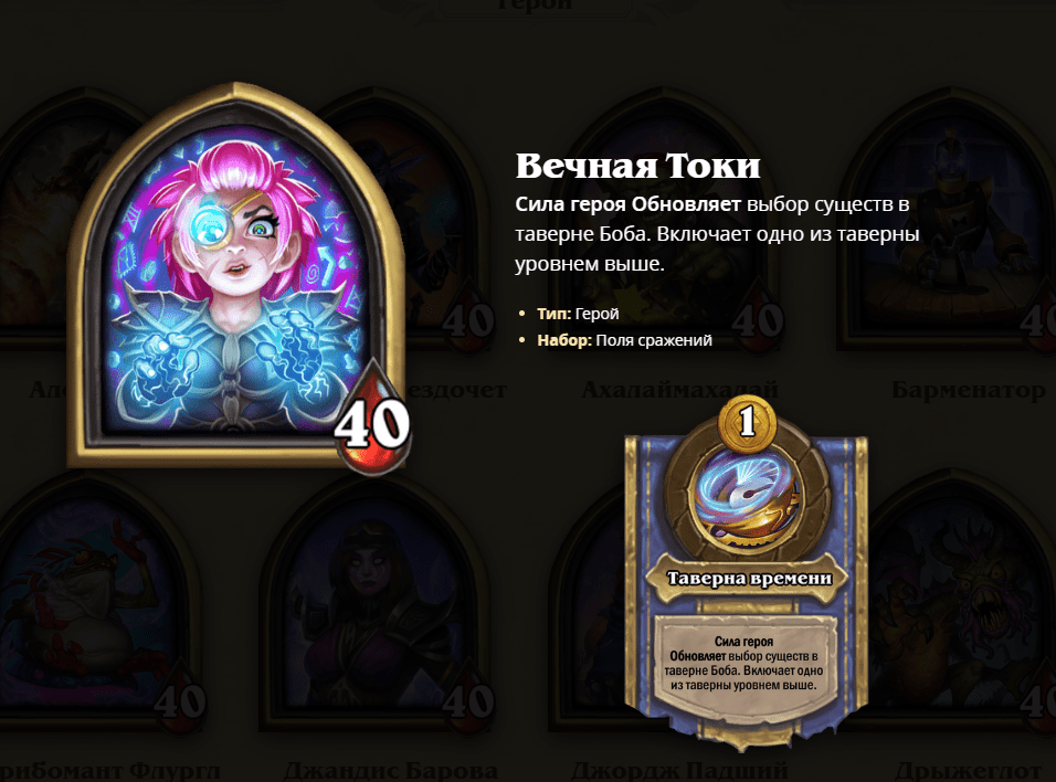 Вечная Токи была финальным противником Токи из настоящего в приключенческом режиме. Но на бг она с самого начала показывала себя достаточно стабильно. И в случае если вы сидите на четвёртой или пятой таверне, то можете получить достаточно сильных существ, таких как Бран Бронзобород, Барон Ривендер, Адаптозавр и многих - многих других. Раньше её абилка стоила 2 золотые монетки, а это большое отставание по темпу. Но близзард прислушались к мнению комьюнити и удешевили способность.Теперь этот герой считается крепким середнячком и не считается зазорным брать именно его.
