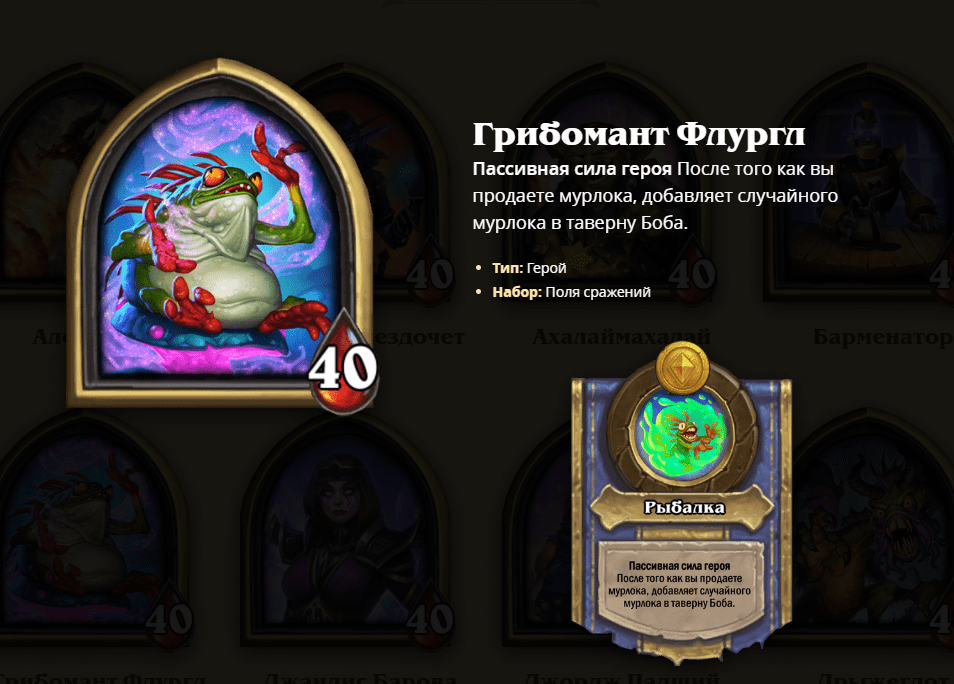Грибомант Флургл являлся квинтэссенцией стратегии на мурлоках, когда в пуле существ еще существовал кроткий мегазавр. Игроки сознательно брали Флургла и искали мурлоков токенов, чтобы благодаря абилке находить более полезных мурлоков с боевым кличем. Ведь после того, как вы продаете мурлока, в таверне боба появляется случайный мурлок. Но после их фикса герой перестал быть таким популярным, хотя некоторые игроки ищут Брана Бронзоборода на пятой таверне и вырываются в лидеры благодаря огромным статам. Но это не всегда работает.