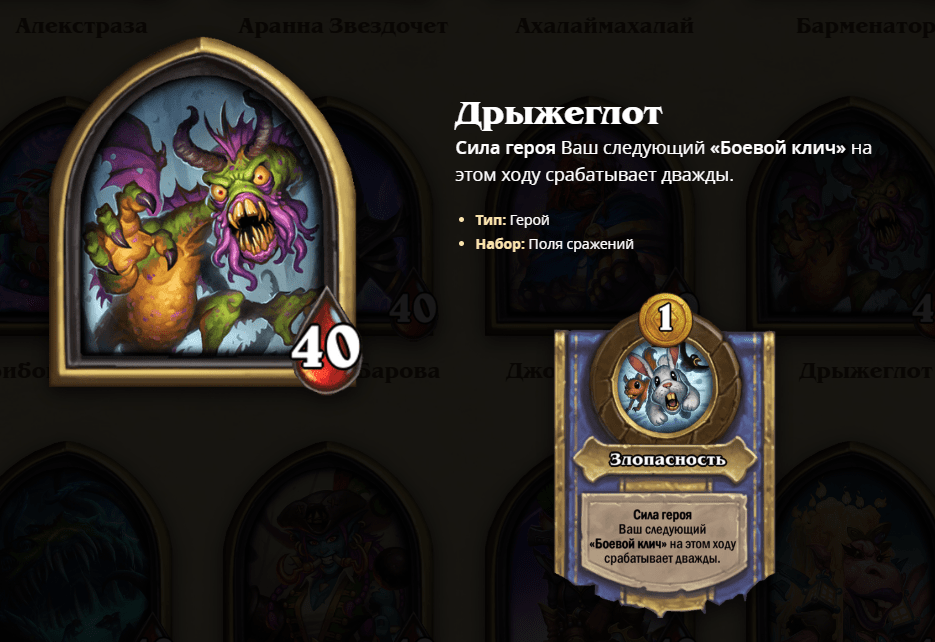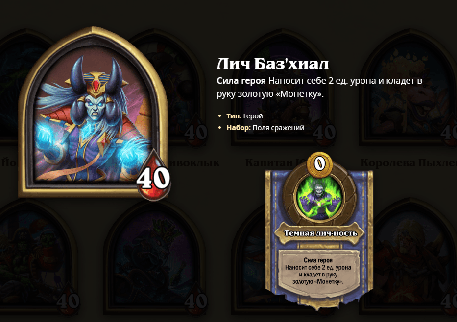 Лич Баз,хиал, как герой, был встречен неоднозначно разношёрстной публикой в харстоуне. Он позволял накапливать в вашей руке монетки в виде карт, для будущего использования. Взамен вы получали 3 ед. урона. И это было, мягко говоря, не фонтан. Но после усиления, вы жертвовали всего лишь двумя единицами здоровья. Это стало дополнительным стимулом, чтобы жать абилку с первого хода и темповать. Это достаточно сложный герой, на котором ты играешь в "пан или пропал". Если вы с самого начала будет терять здоровье, проигрывая драки, то всё меньше у вас будет возможностей нажимать способность. Его любят собирать на демонах, в особенности рано находить МалГаниса, для того чтобы бесплатно крутить абилку. Правда демонов в лобби может и не быть, а ваши демоны по большей части любят, чтобы вы получали урон. Поэтому иногда можно и не дожить до момента, как к вам придут нужные карты. Поэтому герой сейчас находится в три 3 листе и редко берётся новичками. Рекомендуем вам сначала ознакомиться с играми от профессионалов, а уж потом "нагибать" на этом герое.