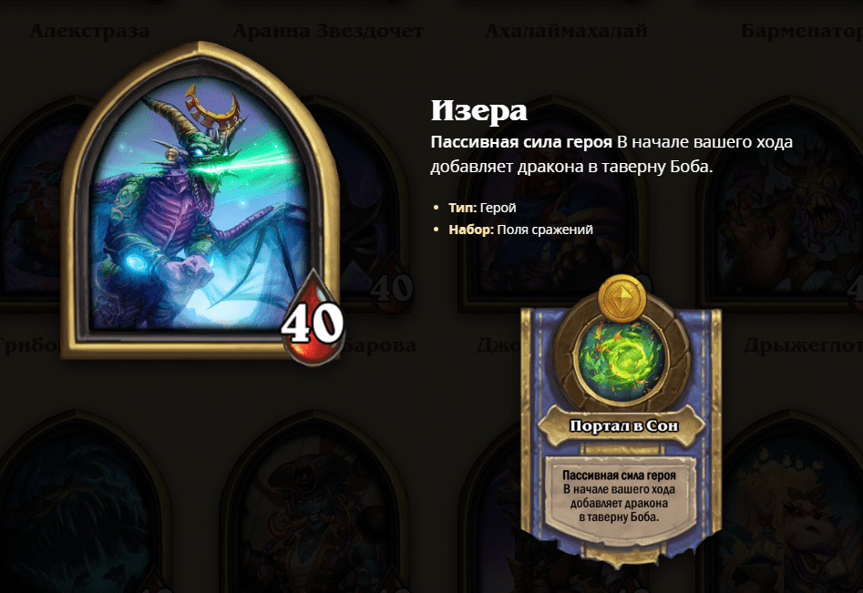 Изера, как и Галакронд и Алекстраза пришла с драконами в патче и в первое время пользовалась популярностью. У вас почти гарантировано была возможность нанять на пером ходу дракона со статами 2\3 и сыграть в ничью или выиграть драку. Но впоследствии после выхода пиратов, владычица сна стала слишком медленным героем, чтобы занимать первое - второе место. Посему и осталась в тир 4. Берите на свой страх и риск и знайте, что на этом персонаже всё зависит от вашей удачи.