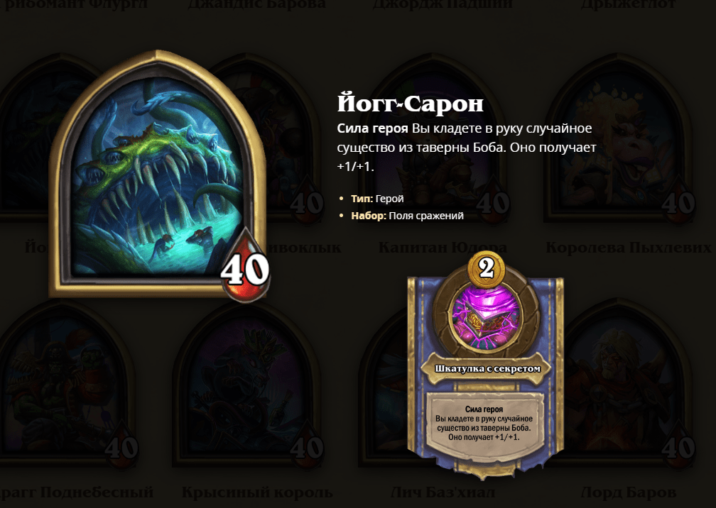 Один из древних богов Йогг-Сарон с самого начала режима был слишком силён. Его способность вербовать случайное существо из таверны Боба да еще и бафать на +1/+1, очень сильно выбивало соперников из колеи. На третий ход имея в наличии всего пять золотых монет вы могли иметь на столе 2 усиленных существа против двух обычных. Сейчас редко кто может что - то противопоставить Йоггу в начале игры, не считая Миллхауса и Рафаама. Но существует авторитетное мнение некоторых профессиональных игроков, что Йогг-Сарон "подкручен" и стабильно вылетает из таверны на 10 ход. Но всё равно древний остаётся силён как ни крути.