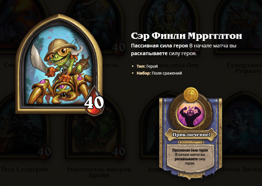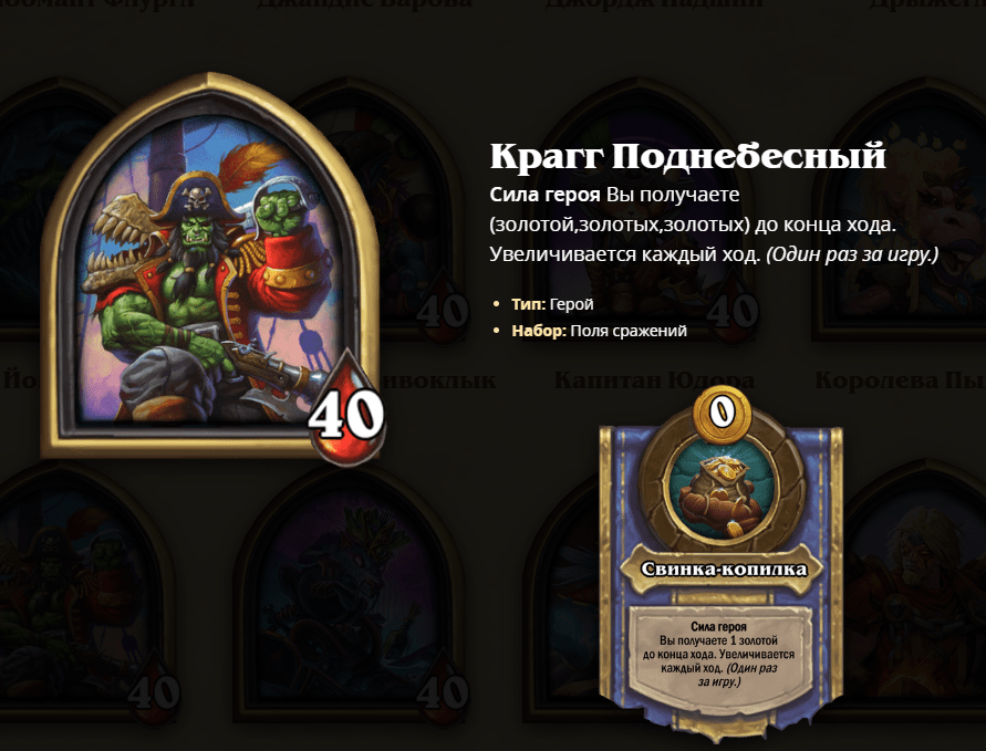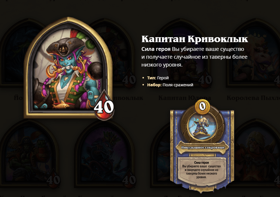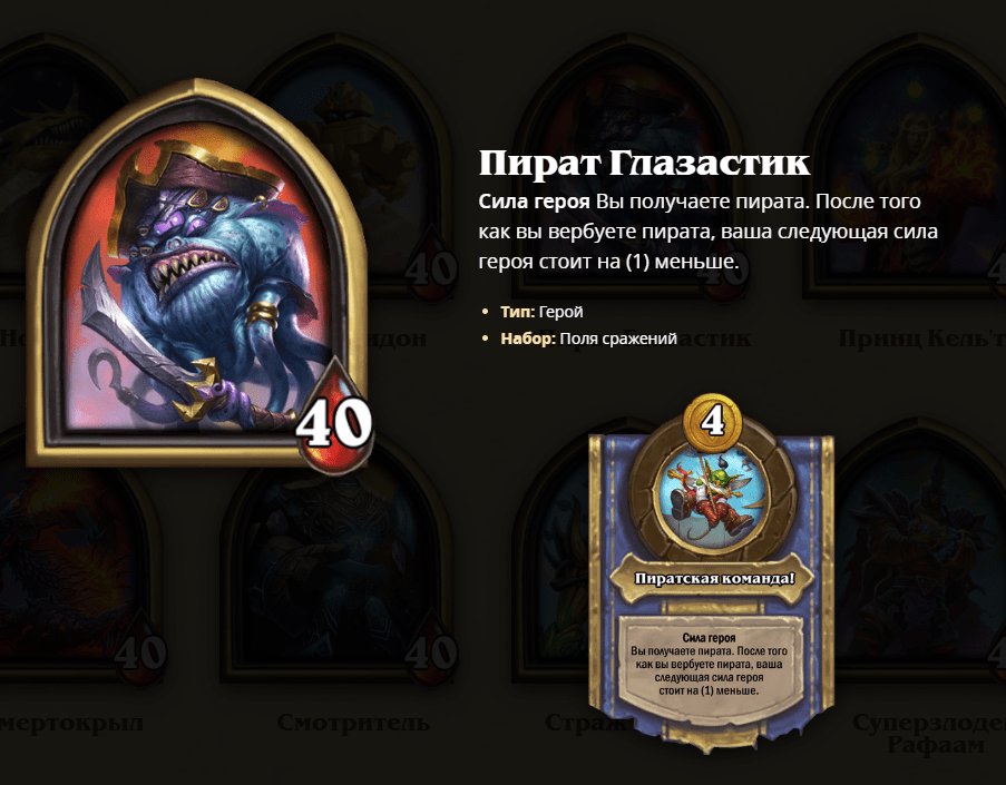 Пират Глазастик знаком всем нам еще с классического режима, где колоды фейс воинов/агро друидов/шаманом наносили огромное количество урона благодаря этому мелкому негодяю. Можете быть спокойны, в полях сражений глазастик не является сильным героем. "Пиратская команда" позволяет получить случайного пирата, однако стоимость способности будет удешевляться на один золотой, если вы будете нанимать пиратов. В целом, это сноубольный герой, которому может зайти, а может и не зайти. Обычно ему выбирают две стратегии и причем они обе на пиратах. Либо вы играете через морского мародера и капитана Др-р-робителя, постоянно покупая всех пиратов и баффая мародера, либо вы играете через жуткого адмирала Элизу, Нат Пэгла и морского голиафа. Конечно, можно попробовать еше собрать себе волнореза и барона Ривендера, но, обычно, к такому позднему режиму глазастик либо выбывает из партии, либо сам выносит всех вперед ногами. Но кого это волнует, если играть на пиратах очень весело. Так что если хотите больше подурачиться и получить положительные эмоции то берите его. Конечно, он занимает и первые места, но происходит это достаточно редко. Так что герой сейчас находится между тир три и тир четыре.