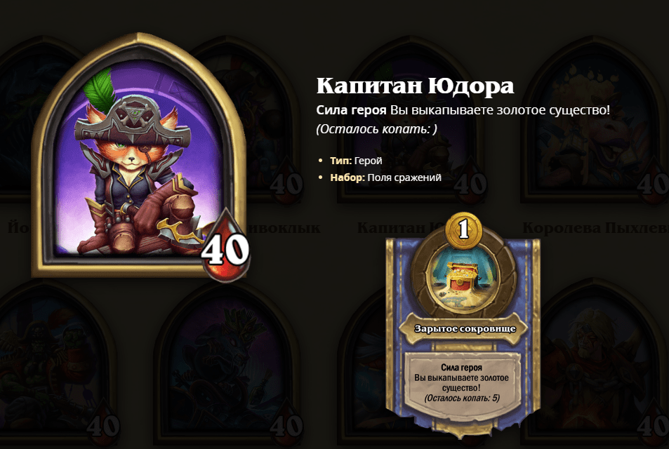 Второй капитан в нашей коллекции, но первый по силе - Капитан Юдора. По - крайней мере был, когда пришла пора пиратам появиться на полях сражений. Существовало две тактики на Юдоре. Медленная и быстрая, которые в зависимости от выбора позволяли рано или поздно получать золотое существо тир один - тир три уровня. Первоначально способность капитана позволяла после четырёх прожатий абилки получать золотое существо. Благодаря этому на момент выхода героя у некоторых профессиональных игроков среднее место при игре за него - 1,86. Это слишком сильно. И близзард оперативно отреагировали на столь имбового персонажа и в нынешней мете копать сокровища совсем невыгодно. Поэтому Капитан Юдора отправилась на дно вместе со своей позицией в тир листе под номером четыре.