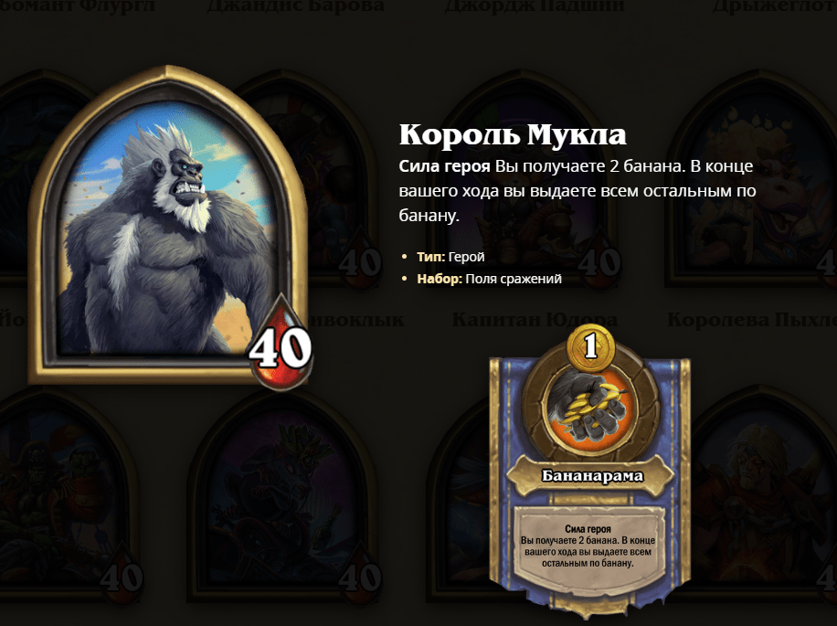 Король Мукла раньше имел пассивную способность давать банан на бафф +1/+1 при покупке зверя, но остальные герои имели либо сильнее способность в лейте, либо в начале игры слишком сильно темповали в начале. Поэтому разработчики приняли решение убрать героя с полей сражений и только недавно вернули обратно. Надо бы заметить, что они не шибко сильно усилили его способность, которая теперь даёт вам 2 банана на +1/+1 и один банан всем остальным в лобби. Это, намного слабее, чем та же способность Ван Клиффа, который сможет забафать существо минимум на +2/+2. Так что мы не советуем брать этого героя.