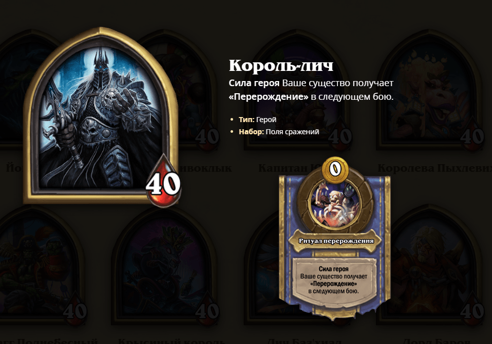 Король - лич благодаря своей способности был достаточно востребованным героем, даже учитывая что первоначально она стоила 1 золотой и "Ритуал перерождения" давался крайнему правому существу. Сейчас личу сделали бесплатную абилку, поэтому он не проигрывает раннюю стадию, а в лейт гейме при наличии "Голдринн, Великий волк" двойной предсмертный хрип позволял вашим существам набрать критическую массу. Также наш король хорошо взаимодействует с предсмертными хрипами механизмов, что позволяет ему достаточно часто занимать верхние строчки. Очень простой и приятный герой, которого мы рекомендуем брать.