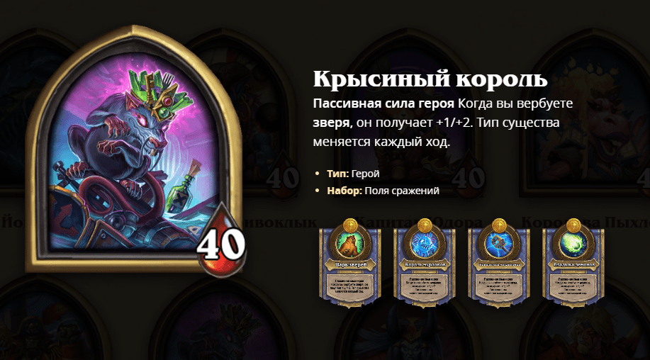 Крысиный король является один из самых гибких и темповых героев со времен начала полей сражений. Раньше, когда в игре на второй таверне было доступно "Кошмарное слияние", крыса активно пикалась и выигрывала игры. Ваша способность позволяет вербовать существо определенного типа с усилением +1/+2. Но сейчас вам может не повезти и вы не сможете каждый ход ловить тот тип существа, который предлагает бармен Боб. Обычно, король собирается через "сборную солянку" и ищет на пятой таверне рыцаря дающего каждый ход каждому типу существ +2/+1, или же Брана с масс баффами. Не самый сильный персонаж на актуально время, но точно не самый худший.