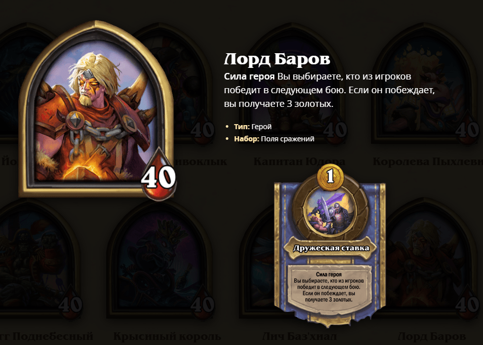 Недавно вышедший в свет Лорд Баров полюбился всем, кто любит рисковать. Ведь ваша способность позволяет сделать ставку на битву двух других игроков и в случае победы получить 3 золотых. Но для этого нужно знать способности каждого героя и кто в какой стадии силён. К тому же, никто не застрахован от миссплеев и герой на которого вы сделали ставку может забыть правильно расставить свой стол и проиграть непроигрываемое. Данный герой строго не для новичков и обязателен к подробному изучению, перед стартом.