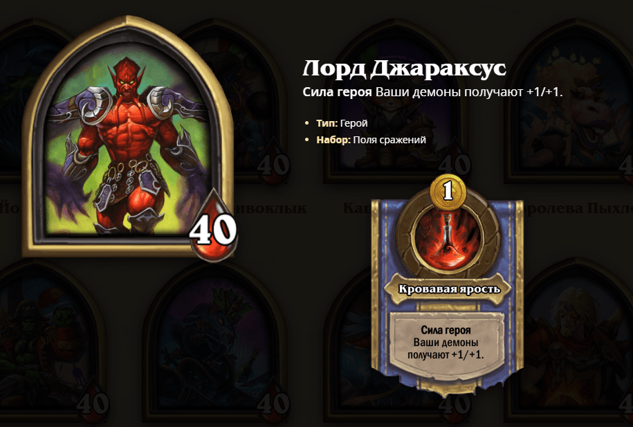 Лорд Джараксус с первых игр понравился любителям играть на демонах. Стратегия на заклинателях гнева была вполне успешной, даже когда его способность "Кровавая ярость" стоила три золотых. Но в один из моментов, его абилка стала проигрывать всем остальным и его перестали брать от слова совсем. Какой бы тяжелой его судьба не была, он получил благословление от разработчиков, которые снизили стоимость до одного золотого. Сейчас этот герой - крепкий середнячок. Можно на нём пофаниться и даже занять 2-4 места и очень редко 1 место.
