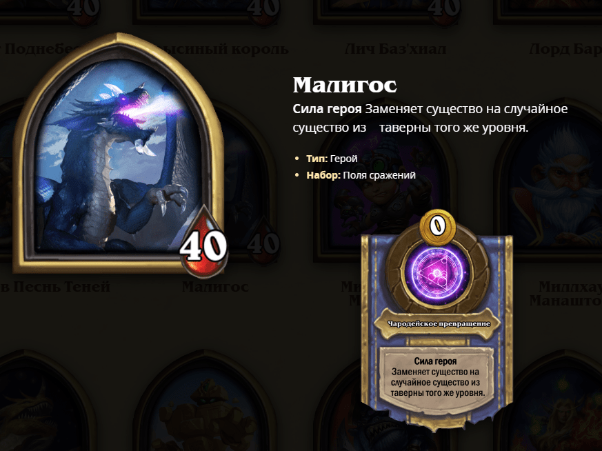 Один из самых слабых драконов на полях сражений Малигос. "Чародейское превращение" заменяет ваше существо на случайное существо из таверны такого же уровня. При ранней игре, если вы нашли мурлока волнолова или котика, вы имеете преимущество перед другими игроками, но чаще всего эта способность работает из рук вон плохо. Если звери или же мурлоки вне игры, то занять второе - четвертое место будет проблематично. Впрочем, всегда есть место хайроллу.