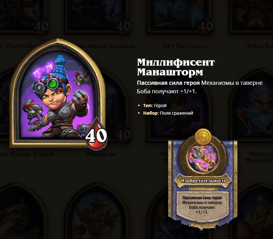 Миллифисент Манашторм претерпевала изменения абилки дважды. В самом начале старта бета теста, её абилка "Изобретательность" была слишком сильной. Ведь в игре всем рулили механизмы и звери. И разработчики не на шутку взволновались, оставив ей только бонус к атаке. И только спустя некоторое время и ввод новых рас позволил вернуться на круги своя и бафать механизмы в таверне боба на +1/+1. Теперь этот герой покинул ряды тир 1, но вполне ещё остаётся достаточно сильным чтобы победить всех лобби на механизмах. Так что вперед, дерзайте!