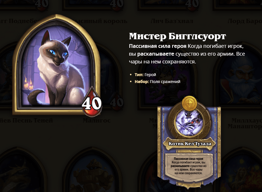 Изначально Миллхаус начинал с двух золотых монет, вы не шибко сильно отличались от остальных героев. Но теперь, когда у вас есть три золотых монеты на старте, вы получаете возможность (при удачном стечении обстоятельств) нанять сразу двух существ на первом ходу. Для этого достаточно найти либо котика, либо мурлока волнолова. И продав приспешника вы сможете взять еще одно существо. Сейчас Миллхаус достаточно интересный герой, который может спокойно занимать первые - четвертые места и стабильно поднимать вам рейтинг. Рекомендуем брать этого героя и учиться на нём играть.