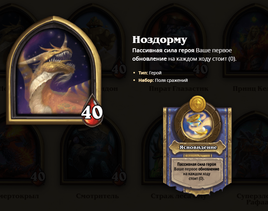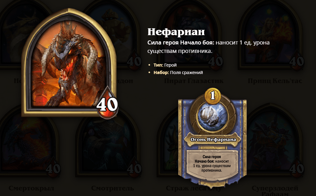 Самый сильный персонаж со старта бета теста Нефариан сейчас остался не у дел. В самом начале его головокружительной карьеры он в пух и прах разносил топовых героев. Правда, надо бы вспомнить, что основные стратегии того времени - механизмы и животные. А его способность "Огонь Нефариана" наносит одну единицу урона всем существам противника. Идеально против механизмов и тактик с божественными щитами. Но в нынешней мете, герой просто бесполезен и занимает призовые места только благодаря удаче и хайроллу.