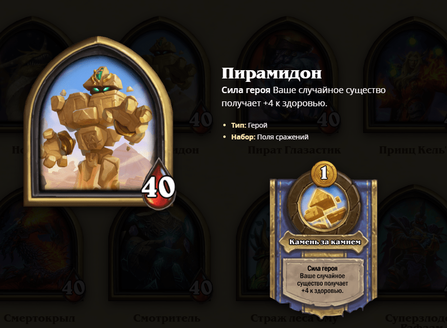 Пирамидон сложен в исполнении и поэтому более популярен на высоких рейтингах. На четырёх тысяч рейтинга вы редко его увидите, но если вы уже знаете как на нём играть, занять первое - второе место вам не составит труда. Сила пирамидки в его способности "Камень за камнем", при нажатии ваше случайное существо получает +4 к здоровью. Вроде бы всё просто? Как бы не так. Первые существа, на которых вы должны обратить внимание - Мурлок - волномут и Микроробот. Эти существа полезны тем, что получают бонус к атаке, а мы тем временем еще и даём им плюс четыре к здоровью каждый ход. На этом герое очень важно поймать середину между улучшением таверны и заполнением вашего стола. В будущем, сила вашего героя перестанет играть большую роль, однако со столом, где вы меняете лишь существ с баффами, могут произойти неприятные для ваших противников изменения. Герой достаточно сложный для понимания и в первую очередь надо посмотреть известных и опытных стримеров, прежде чем выбирать его в игре. Сейчас он находится в тир 2 и если у вас есть опыт игры на нём, можете не сомневаться, ваш рейтинг будет только повышаться от игры.