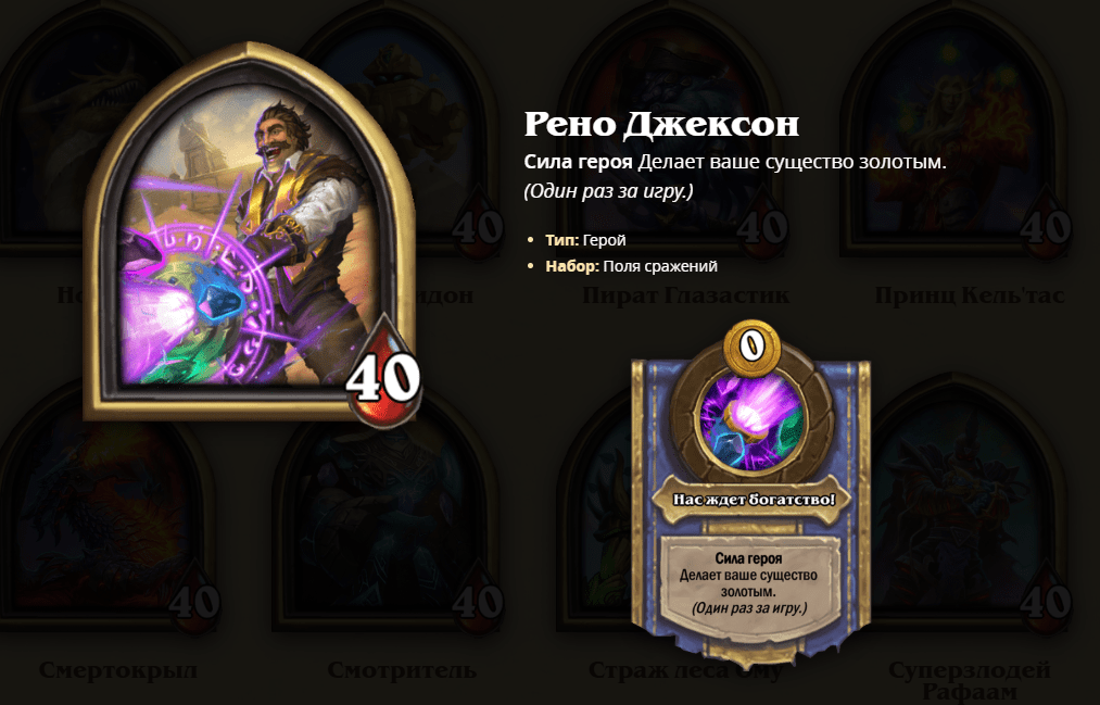 Рено Джексон полюбился всем, кто играл на контроль варлоках еще в обновлении древние боги. Но в этом режиме он предстал пред нами со способностью "Нас ждет богатство!", которое золотит любое ваше существо за бесплатно. Изначально стоимость силы героя четыре золотых, однако разработчики быстро сообразили, что это очень дорого и темп Рено не может поддерживать, поэтому сократили стоимость сначала до трёх золотых монет, потом до двух, а затем и вовсе сделали бесплатной. Никто не был удивлён, что процент побед на данном герое стал расти, хотя по статистике это не самый сильный персонаж, со своими сложностями.
