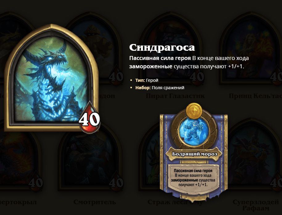 Синдрагоса один из тех персонажей, которых не трогали с момента ввода в игру и мы уверены что если она и будет изменена, то несильно. "Бодрящий мороз" очень неплоха в начале игры и не требует от вас сложных математических вычислений, однако ближе к концу игры, если вы не нашли сильные карты, способные менять ход игры, занять первые строчки вам будет ох как непросто. Эта пассивная способность даёт существам в таверне боба +1/+1 в конце вашего хода, при условии, что вы их заморозили. Особых стратегий на этом несчастном драконе нет, она играется со всеми типами существ и любой попавшейся под руку схемой. Благодаря темпу, вы можете скупать сильных замороженных существ и давить соперников, либо же с помощью хорошего старта попытаться повысить один два уровня таверны и быстрее всех найти ключевых для вашей стратегии существ. Это может быть кто угодно, от зверей до механизмов, от пиратов для драконов. Герой очень простой и интересный, но сейчас находится между тир три и тир четыре. Для ознакомления с режимом можете поиграть на ней, если она вам, конечно, попадётся, и ознакомиться со способностями других героев, посредством прямого контакта.