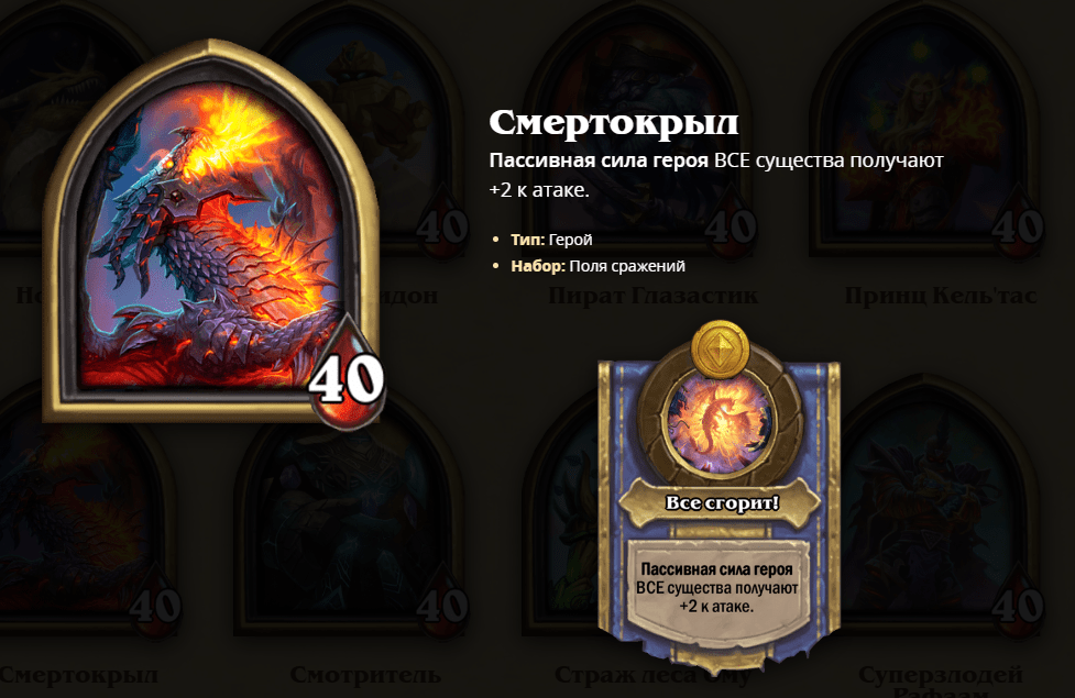 Смертокрыл один из самых часто выбираемых персонажей. Когда он только появился в игре, мало кто знал, что делает его абилка. "Всё сгорит" это пассивная сила героя, при постоянном действии которой все существа (и ваши и врага) получают 2 атаки. Даже те, кого не было на столе изначально получат этот бонус (существа с предсмертными хрипами). Герой достаточно зависим от типов существ, которых нет в игре. В особенности он страдает если нет зверей. Потому что главная цель этого безумного дракона извлекать из своих существ больше пользы, чем соперники. Например имя бабушку или крысиную стаю, вы получите намного больше пользы, чем враг. Особенно это относится к крысе. Сейчас она находится на третьей таверне, но пользы от неё будет намного больше чем от других существ вместе взятых. Также хороша стратегия с механизмами. Например взять блокобота с божественным щитом и примагнитить к нему репликатора с предсмертным хрипом (после которого появляются микромашинки). Вообще, стратегии смертокрыла достаточно простые. Либо вы берёте зверей с большим количеством предсмертных хрипов а также гидру с Голдринном, либо вы играете на механизмах, хотя их можно сочетать с божественными щитами на драконах и нейтральном существе (Болвар). Резюмируя всё вышесказанное это стабильный тир два герой с простым геймплеем.