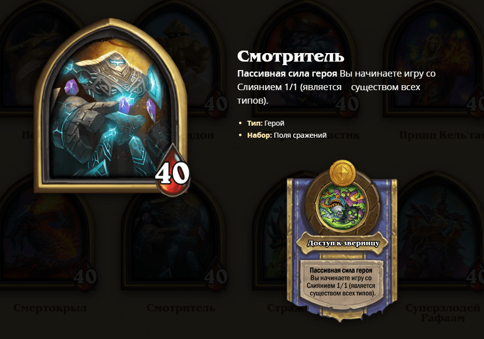 Смотритель в самом первом патче являлся одним из сильнейших героев. А всё потому, что "Доступ к зверинцу" позволял начинать партию со слиянием 1/1. Это существо всех типов. И пират, и дракон, и демон, и зверь и так далее. Поэтому все баффы от различных существ будут действовать на него. К тому же вы с большой вероятностью не проиграете раннюю стадию, а с если фортуна вам благоволит, и выиграете. Но к середине игры необходимо соблюдать баланс и стараться делать акцент не только на слияние, но и на весь стол в целом. Данный персонаж сейчас является немного медленным и не всегда может поспевать за топовыми героями, однако, если вы найдёте золотую середину то топ 2 - топ 4 вам обеспечено, хотя за топ один вам придётся побороться. В целом, это простой персонаж не требующий особых умственных усилий, поэтому как середнячок сойдёт.