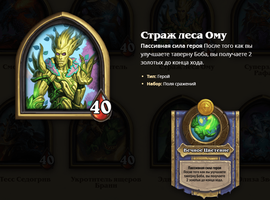 Страж леса Ому новый герой, введённый разработчиками в начале сентября и хоть он не так долго находится на полях сражений, игроки уже прочувствовали его мощь и записали его в тир 1 коллектив. Благодаря его способности "Вечное цветение" Ому может намного быстрее других повышать уровень таверны (бедный барменатор) и не проседать по темпу. Он не привязан к какой - либо стратегии и может отталкиваться от ваших предпочтений по игре. А ранняя шестая таверна обеспечит вас сильными существами. Ничего сложного по игре за этого персонажа нет, так что если он вам выпадает при выборе героев, берите и не задумывайтесь. Топ один - топ четыре вам практически гарантирован