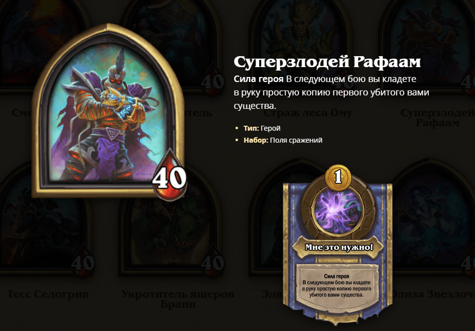 Великий вор Рафаам (Рофлаан в исполнении одного стримера) является одним из самых интересных героев, за которого ты переживаешь каждый ход. А вся суть в том, что его способность "Мне это нужно" позволяет всего за один золотой положить в руку копию первого убитого существа соперника. Однако стоит весьма аккуратно пользоваться способностью, ведь иногда вы можете не убить ни одно существо у соперника на столе, или же превратить вашу пару сильных карт в триплет, что будет сродни ослаблению. Особенно частая ошибка на втором ходу не смотреть, на какого героя вы попадаете и нажимать способность. И часто бывает (подозрительно часто), что это А.Ф.Ка, у которой на втором ходу нет и быть не может никаких существ. Но в целом сам персонаж является достаточно сильным и при небольшой толике везения, вы можете своровать очень полезных существ, которые выиграют вам игру. Рафаам очень часто занимает первые - четвертые места, и не так сложен, как Дэрил или Тесс. Так что если увидели его в выборе героев, берите, не стесняйтесь, вам точно понравится!