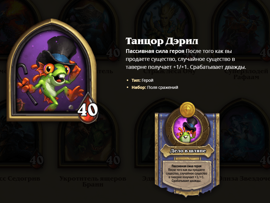 Танцор Дэрил, он же мистер шляпник с первых патчей и по сей день остаётся достаточно грозным соперником. Его способность "Дело в шляпе" позволяет при продаже существ получать дважды +1/+1 случайному существу из таверны боба. Получается, что если вы купили трёх существ из четырёх, последнее оставшееся получит нереальный буст по статам. Благодаря этому в умелых руках танцор может занимать в каждом лобби, независимо от типов существ от топ 4 и выше. Уникальный геймплей позволяет Дэрилу с ранних ходов начинать агрессировать и давить оппонентов своими плотными существами. Крайне важно на первых порах найти бродячего кота или мурлока волнолова, которые призывают дополнительное существо. Обычно они и продаются в таверну для использования абилки. Стратегий у Дэрила множество. Можно играть через божественные щиты или через существ с атакой по разным целям, можно найти Брана или Кадгара вместе с токенами, чтобы призывать больше существ на стол и продавая бафать сильные карты. Конечно, с первого раза вы вряд ли разберетесь когда вам нужно поднимать уровень таверны, а когда продавать ненужных существ, но в целом. понимание приходит достаточно быстро и сыграв три четыре партии, к вам придёт успех. Крайне рекомендуем этого персонажа для стабильного поднятия рейтинга.