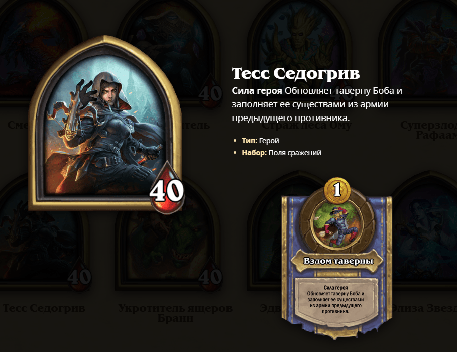 Тесс Седогрив сравнительно новый персонаж, и достаточно медленный для текущего хаоса на полях сражений. Но сама способность при грамотном использовании даёт возможность собирать золотых существ и добирать необходимые вам карты со стола соперников. "Взлом таверны" позволяет обновить таверну боба и заполнить копиями существ со стола противника. Однако, не надейтесь, золотые существа будут превращены в обычные. Важный совет, способность достаточно слабая в начале игры и расцветает ближе к середине. Необходимо всегда держать в уме предыдущий стол противника, чтобы знать какие существа вам нужны для усиления. Так что этот герой требует высокого скилла от игрока и глубокое понимание игры. Поэтому, если вы только начали играть, лучше всего её пропустить и посмотреть пару подробных гайдов