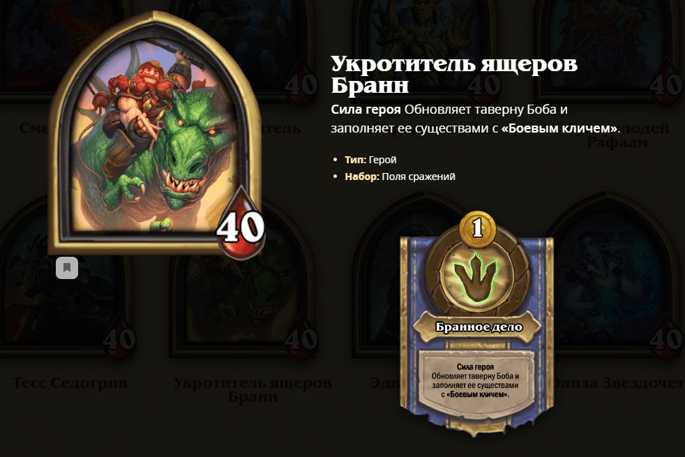 Изначально Укротитель ящеров Бранн имел пассивную способность, которая при розыгрыше существа с "Боевым кличём" бафала ваше случайное существо на +1/+1. Но это оказалось очень сильным по меркам того патча и спустя некоторое время Бранна исключили из игры, а затем вернули с новой интересной механикой. Теперь способность называется "Бранное дело" и всего лишь за одну золотую вы обновляете таверну Боба и заполняете её существами с "Боевым кличём" того же уровня и ниже. Это позволяет вам играет по нескольким стратегиям сразу. Например на второй таверне искать прыг-скокеров, или же просто получать хорошие боевые кличи для сильных существ. Герой сейчас находится на перепутье между тир 1 и тир 2. Так что если он вам попался при выборе героев, можете его смело брать.
