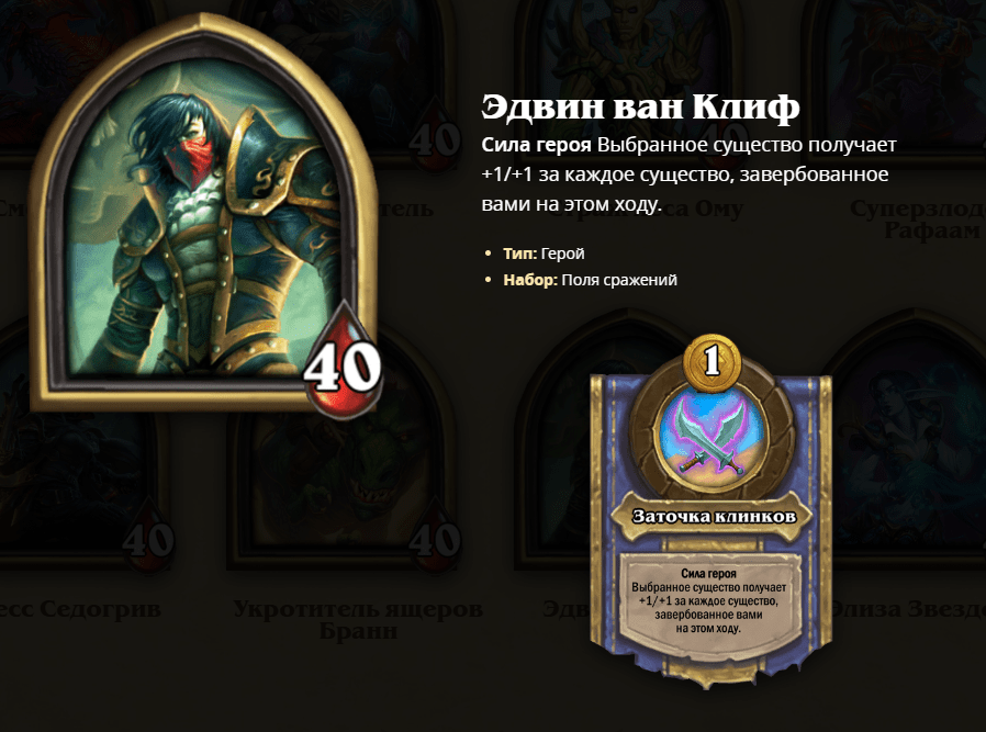 Эдвин Ван Клиф вполне походит на обычного героя полей. До третьего хода он ведет себя как все простые персонажи. Но после получения достаточного количества монет, вы сможете использовать свою силу под названием "Заточка клинков". Выбранное вами существо получает +1/+1 за каждое нанятое существо на этом ходу. Смекаете? Каждый ход, имея 10 золотых монет, наш доблестный мятежник может баффать своих кор существ на +3/+3, а иногда и на более внушительные цифры. Самыми хорошими для вас могут быть существа с божественными щитами (Блокобот и бронзовый страж с третьей таверны, Болвар с четвертой или те, кто атакует сразу же несколько целей (Врагорез на шестой таверне и гидра на четвертой таверне). Это самые простые примеры. В реальности для выживания вам придётся кого только не баффать, чтобы выжить. Но в целом, это достаточно интересный и разнообразный герой, которым не грех научиться играть.