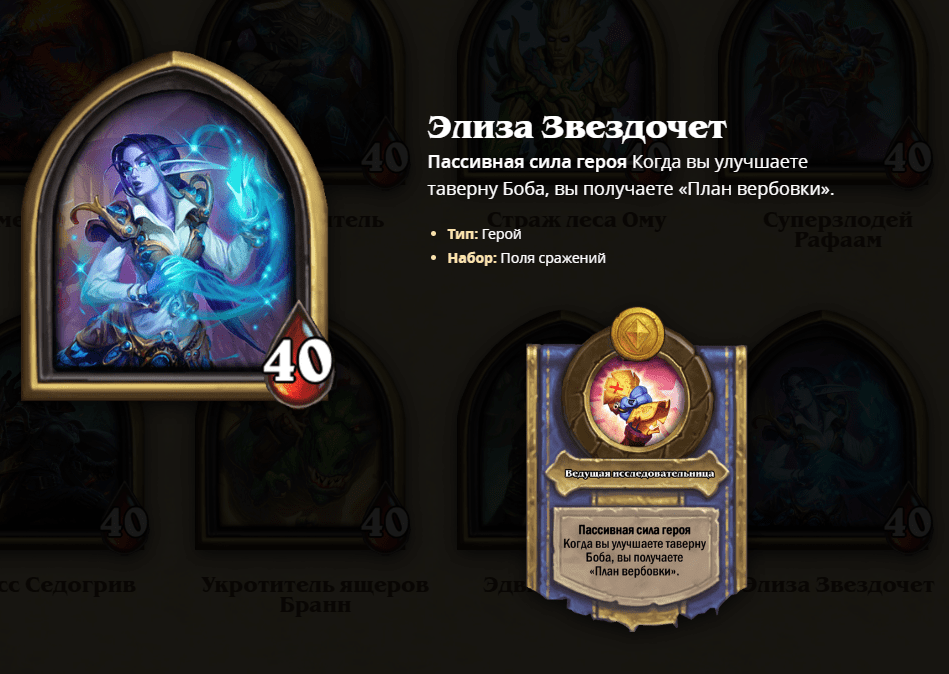 Элиза Звездочёт была одним из самых недооцененных героев перед выходом дополнения "Натиск драконов". При помощи своей силы героя "Всеведущая исследовательница" мы получаем "План вербовки". Эта карта дает нам возможность выбрать одно из трёх существ текущего уровня таверны. Достаточно сильно выглядит на четвертых, пятых и шестой тавернах, поскольку вам в таверне боба вряд ли попадутся сразу три существа одного уровня. Но на этом плюсы заканчиваются, поскольку это слишком медленно в текущих реалиях патча и многие персонажи выносят её со старта вперёд ногами. Поэтому тир 4 для Элизы самое то. Конечно, можно попробовать занять топ 2-4 но это будет больше чудом, чем вашей заслугой. Так что героя рекомендуем пропустить.
