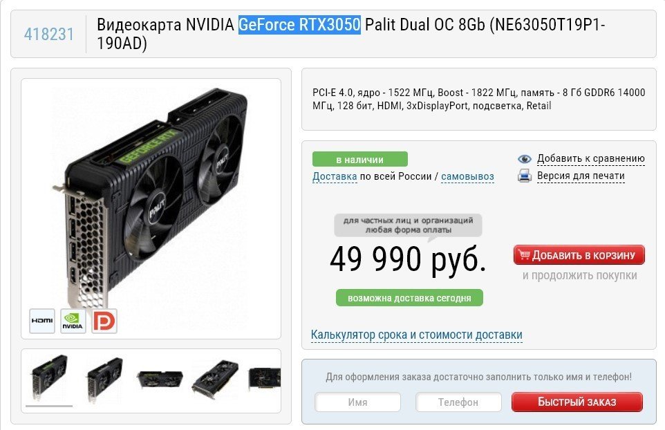 В Регарде представлена только 1 модель — NVIDIA GeForce RTX 3050 в исполнении Palit. Готовьтесь заплатить за нее 50 тысяч рублей.