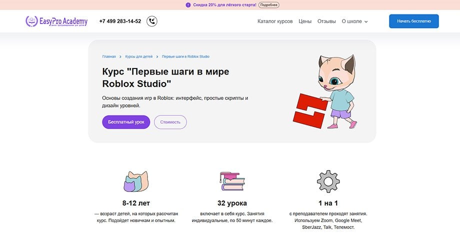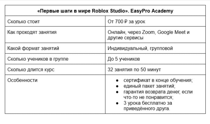 EasyPro Academy — это онлайн-школа, которая сфокусирована на курсах по программированию. В том числе — в Roblox. Здесь делают акцент на индивидуальном сопровождении: после каждого урока ребенок получает домашнее задание, которое после проверяют и разбирают ошибки. Также EasyPro гарантирует отчеты родителям об успехах.