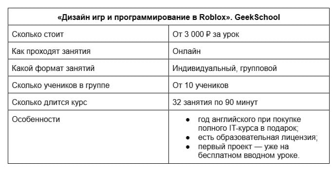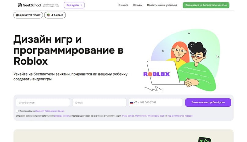 GeekSchool — это детское образовательное направление от платформы GeekBrains, которое помогает школьника шаг за шагом погружаться в IT. Школа подчеркивает, что на курсе Roblox дети не просто играют, а учатся создавать. Например, на уроках их ждет разработка дизайна уровней, программирование логики, визуальные эффекты и 3D-моделирование.