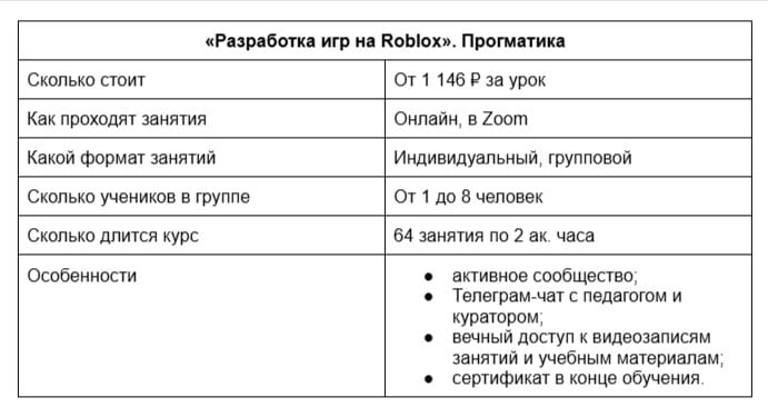 Курс Roblox у Прогматики обучает школьников основам Lua и работе в Roblox Studio — создавать объекты в 3D и логику простых игр. При этом школа подчеркивает связь с университетской средой — преподаватели знакомы с академическим подходом, а ученики могут получить буст для дальнейшего IT-образования.