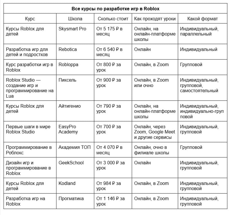 Рассказываем о курсах по Roblox и Lua для ребят любого уровня: сколько стоят, чем различаются и какие обещают результаты. В конце сравниваем все курсы подборки и дарим бонус — 5 бесплатных полезностей, которые помогут вникнуть в Roblox самостоятельно.