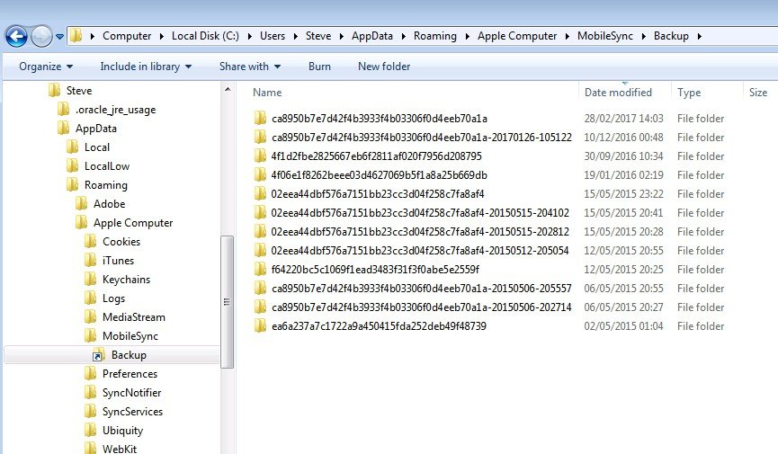 - Откройте папку «C:\Пользователи\имя_пользователя\AppData\Roaming\Apple Computer\MobileSync\Backup\» (название диска может отличаться);