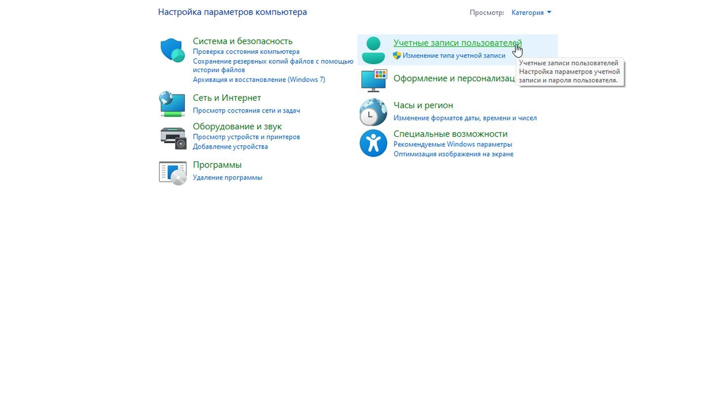 - Выберите «Учетные записи пользователей» или «Учетные записи и семейная безопасность», в зависимости от версии Windows.