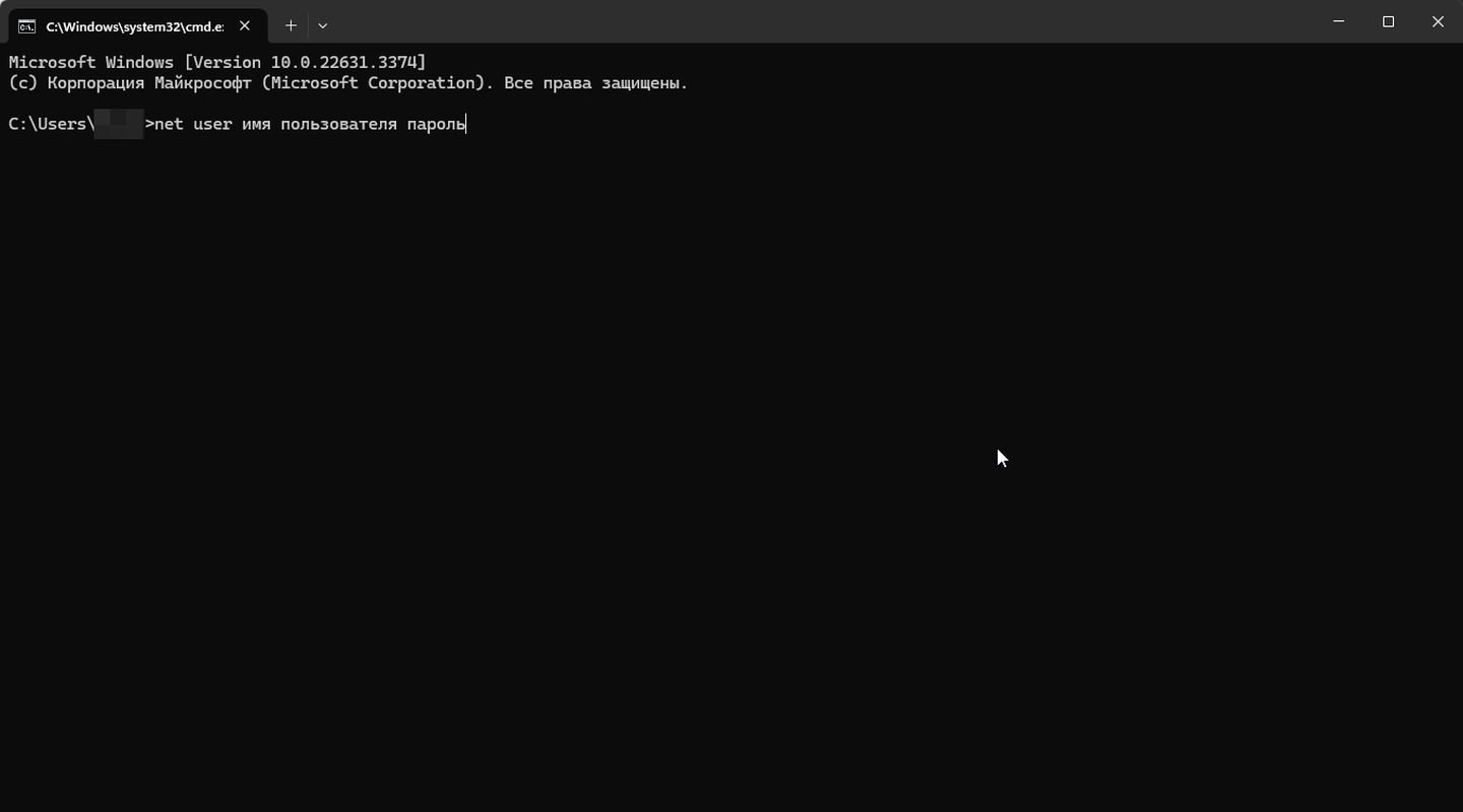 - Введите команду «net user имя_пользователя новый_пароль» и нажмите Enter;