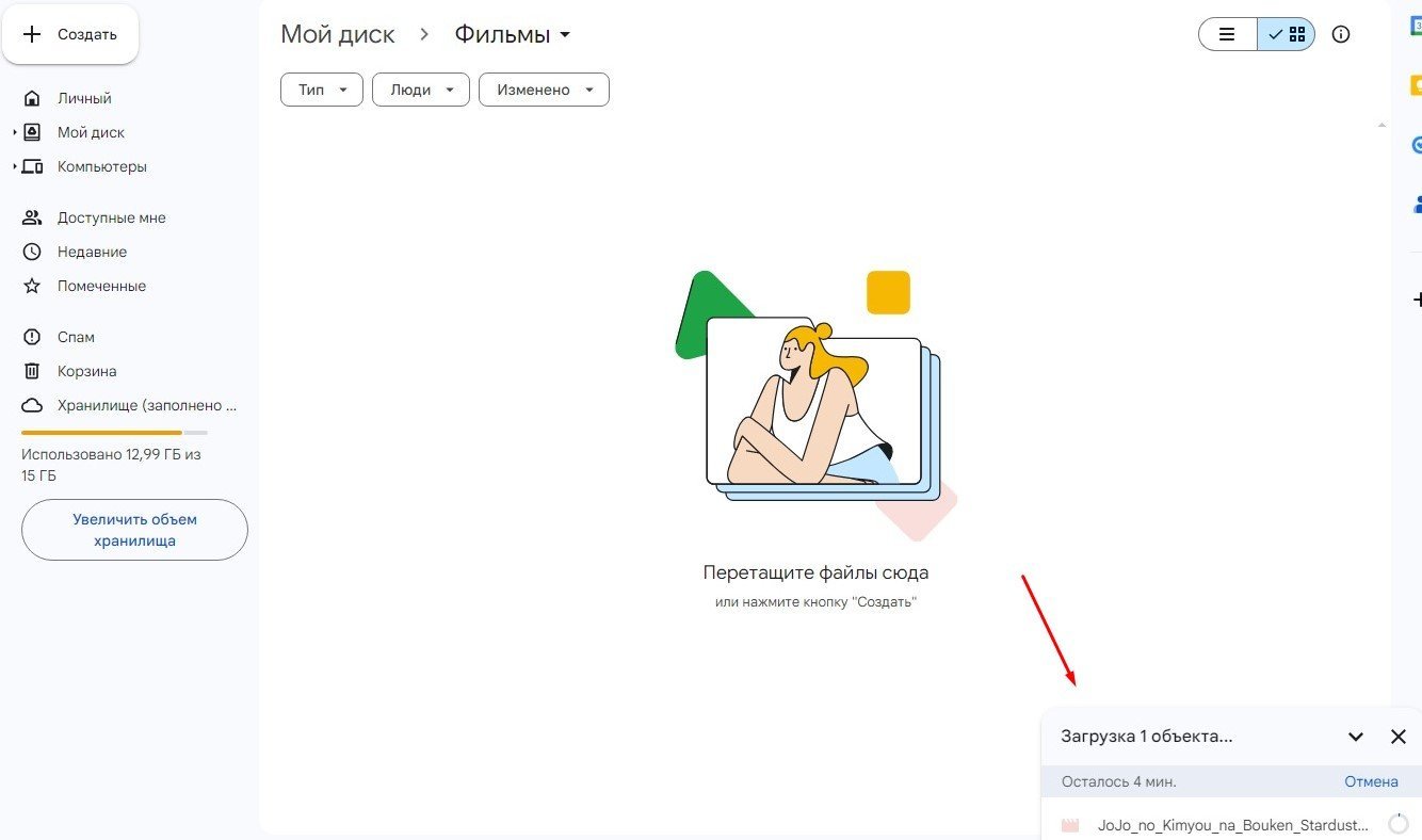 - Войдите с ПК на сайт сервиса, «перетащите» файл с фильмом в нужную папку в облаке и дождитесь загрузки;