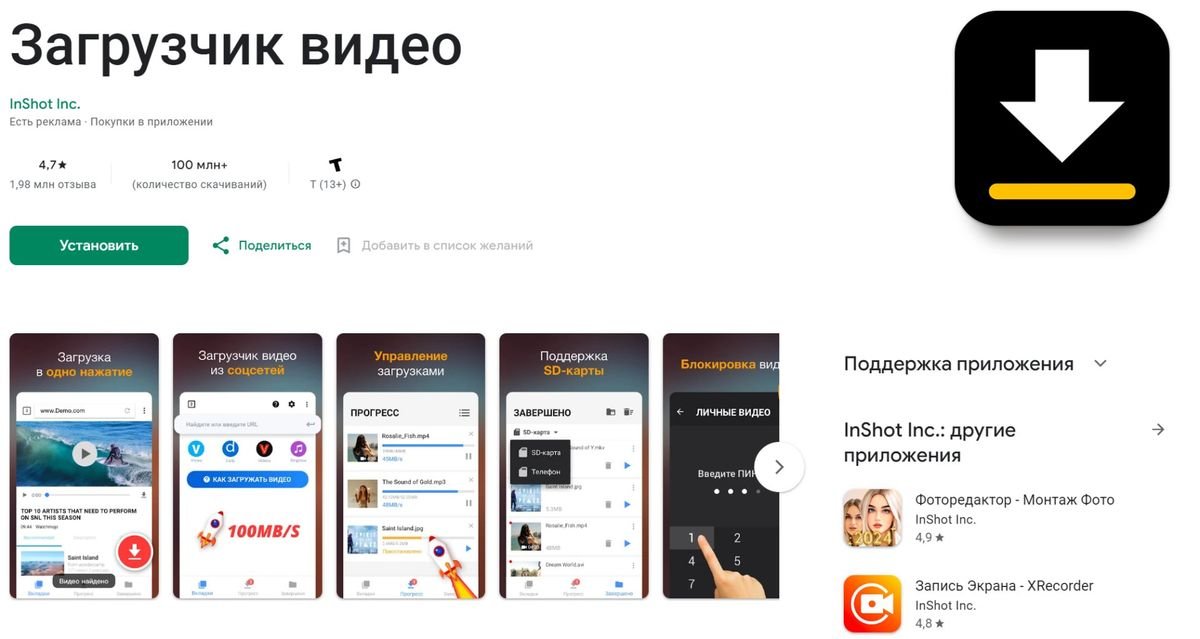 Для скачивания видео на Android-устройствах необходимо скачать специальную программу. Например, «Загрузчик видео» от разработчика InShot Inc.