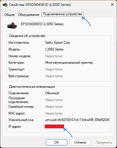 - В списке вы сможете увидеть сетевой адрес принтера и другие сведения о подключении.