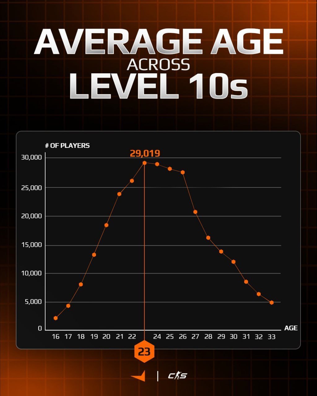 В FACEIT опубликовали новую инфографику по своим пользователям, которая показывает распределение игроков Counter-Strike 2 по возрасту и уровню. Согласно данным платформы, больше всего игроков 10-го уровня приходится на возраст около 23 лет. После этого показатель начинает снижаться.