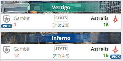 Astralis одолели команду Gambit Esports со счётом 2:0 – Vertigo 16:9 (выбор Gambit), Inferno 16:12 (выбор Astralis).