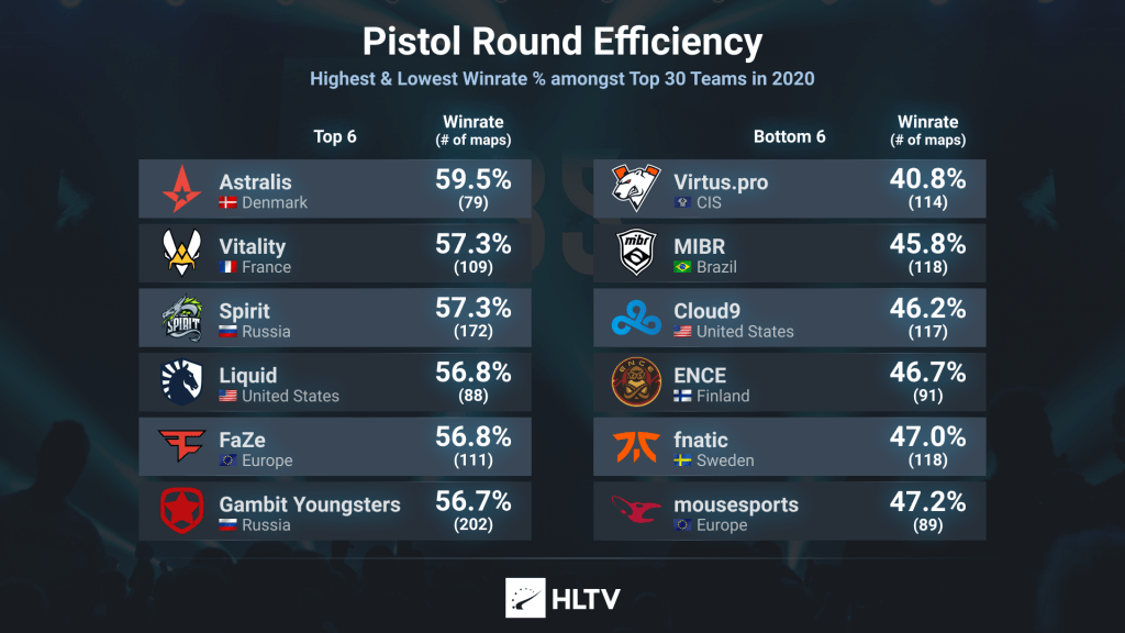 Портал HLTV.org опубликовал список лучших и худших команд CS:GO по проценту побед в пистолетных раундах по итогу первой половины 2020 года. Лучшим коллективом по данному показателю стали Astralis.