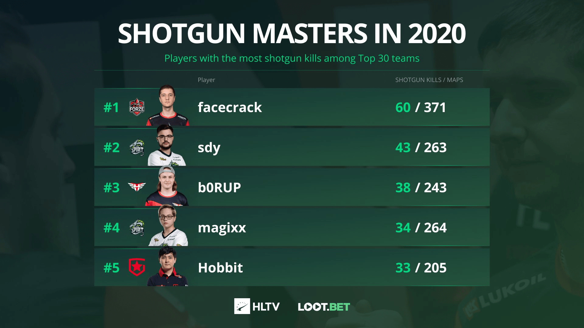 Портал HLTV.org продолжает делиться в Twitter интересной статистикой из профессиональных матчей CS:GO за 2020 год. На этот раз был опубликован топ игроков по убийствам с дробовиков.