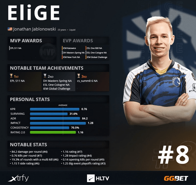 Игрок коллектива Team Liquid Джонатан "EliGE" Яблоновски занял восьмую строчку в рейтинге лучших игроков 2020 года в CS:GO по версии портала HLTV.org.