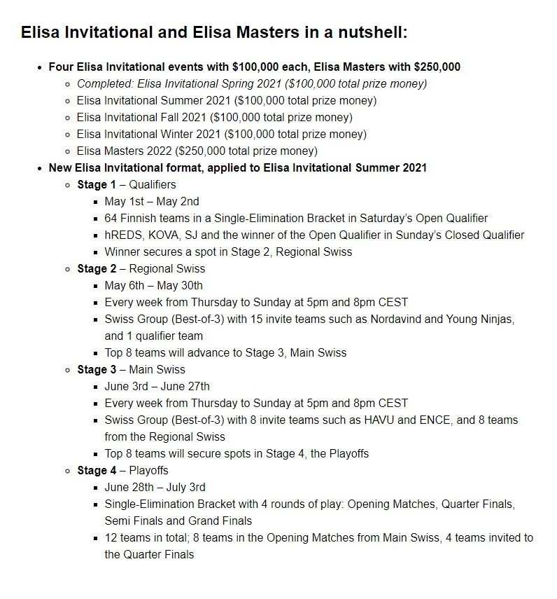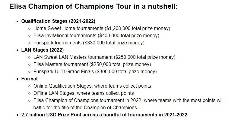 В своем официальном твиттере финский турнирный оператор Elisa Esports сообщил о том, что он объединяется с Funspark, Relog Media и аналитическим сервисом GRID для того, чтобы провести с 2021 по 2022 год серию турниров с общим призовым фондом в размере 2,7 миллиона долларов.