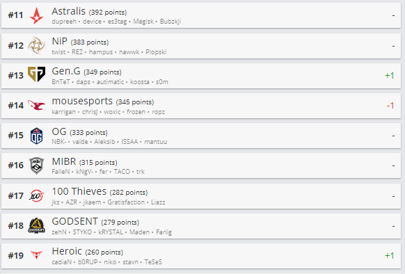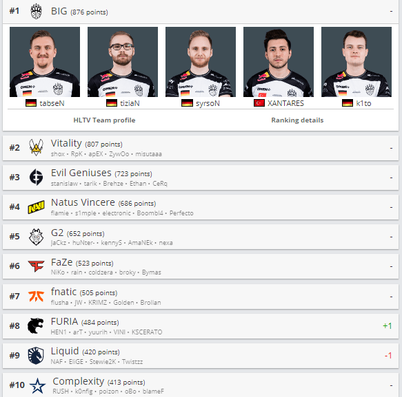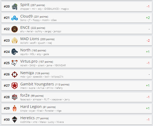 Team Spirit, VP, Nemiga, Gambit.Y, forZe и Hard Legion. А в топ-20 из нашего региона входят лишь Natus Vincere (4 место).