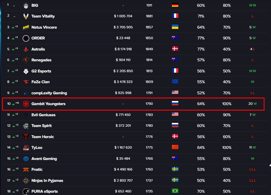 В рейтинге от CQ команда Gambit Youngsters поднялась аж на 13 строчек и занимает 10 место.