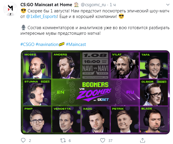 Студия Maincast на своей странице в Twitter представила комментаторов и аналитиков, которые будут освещать шоу-матч между NAVI 2010 и NAVI 2020.
