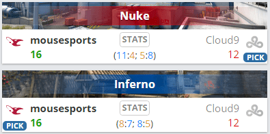 Mousesports одолели команду Cloud9 со счётом 2:0 – Nuke 16:12 (выбор Cloud9), Inferno 16:12 (выбор mousesports).