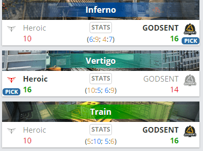 GODSENT обыграли коллектив Team Heroic со счётом 2:1 – Inferno 16:10 (выбор GODSENT), Vertigo 14:16 (выбор Heroic), Train 16:10 (десайдер).